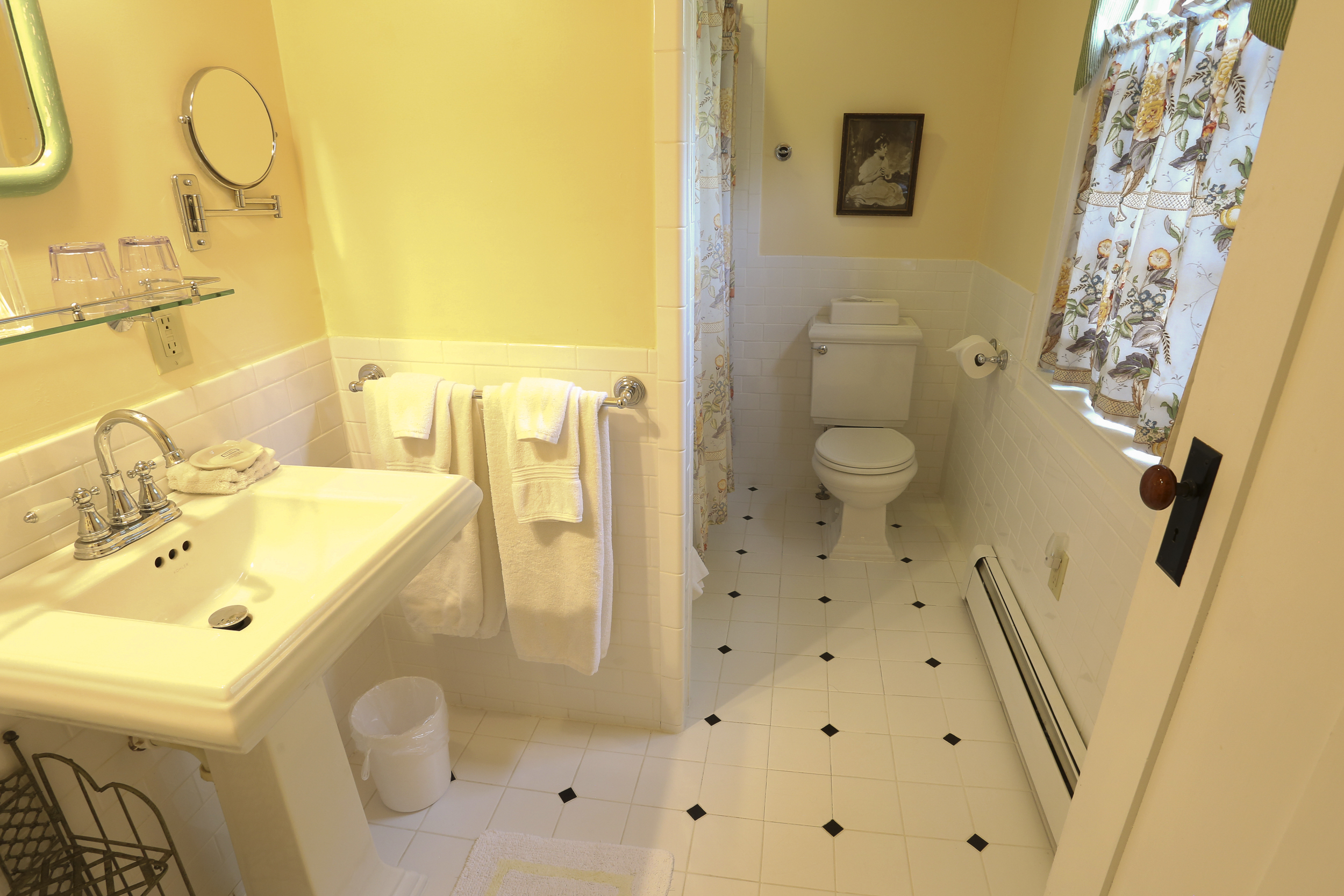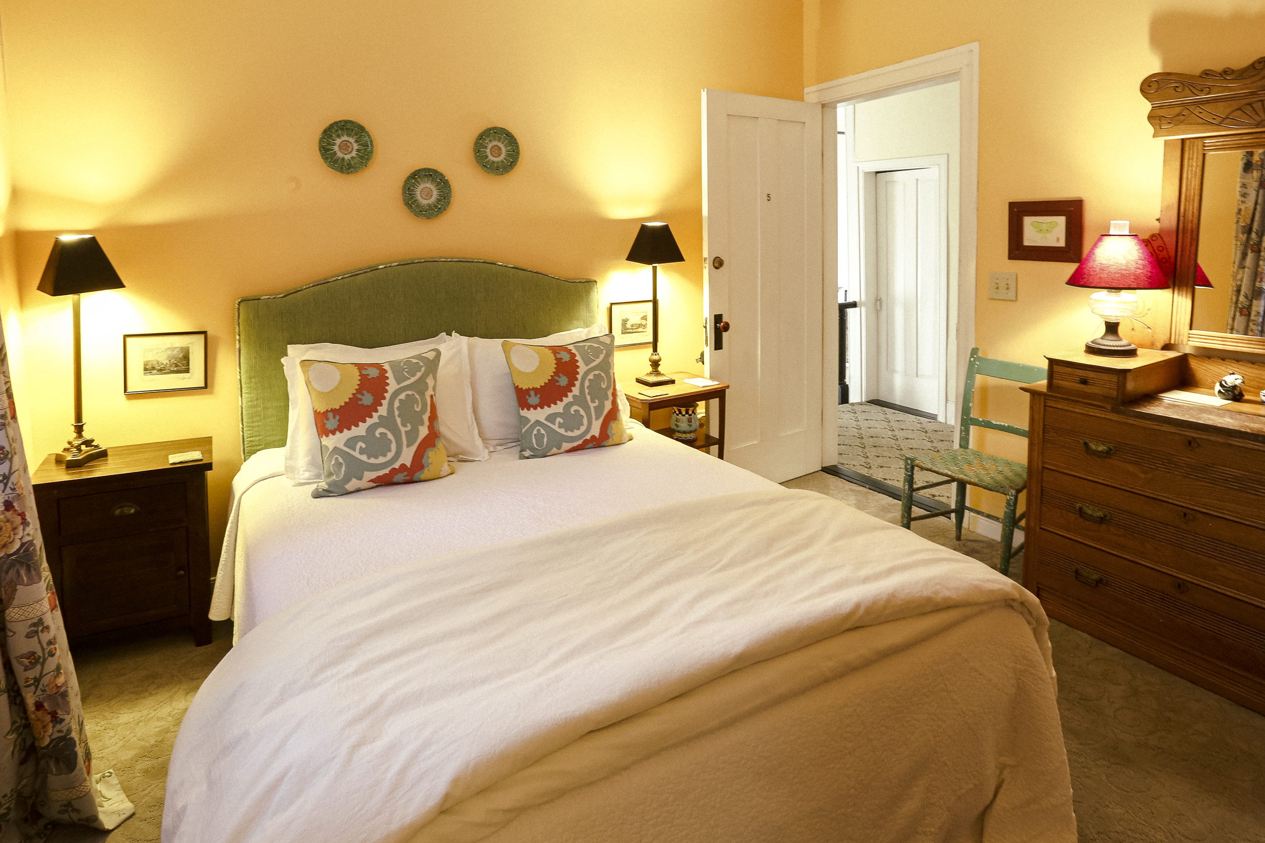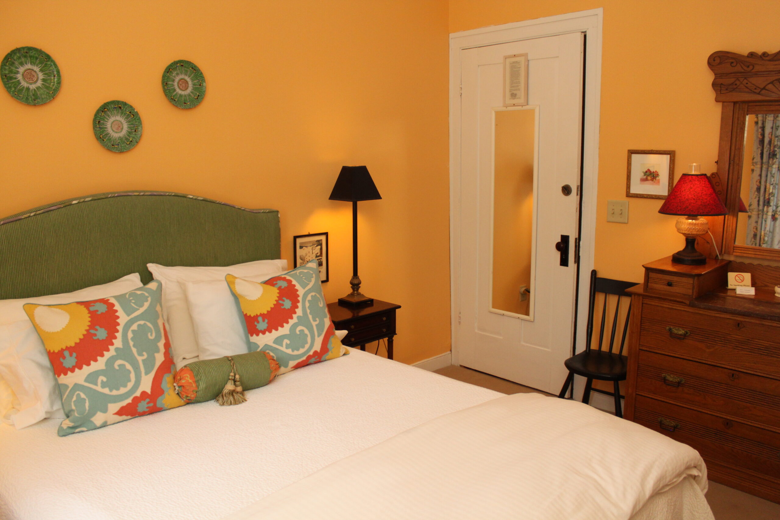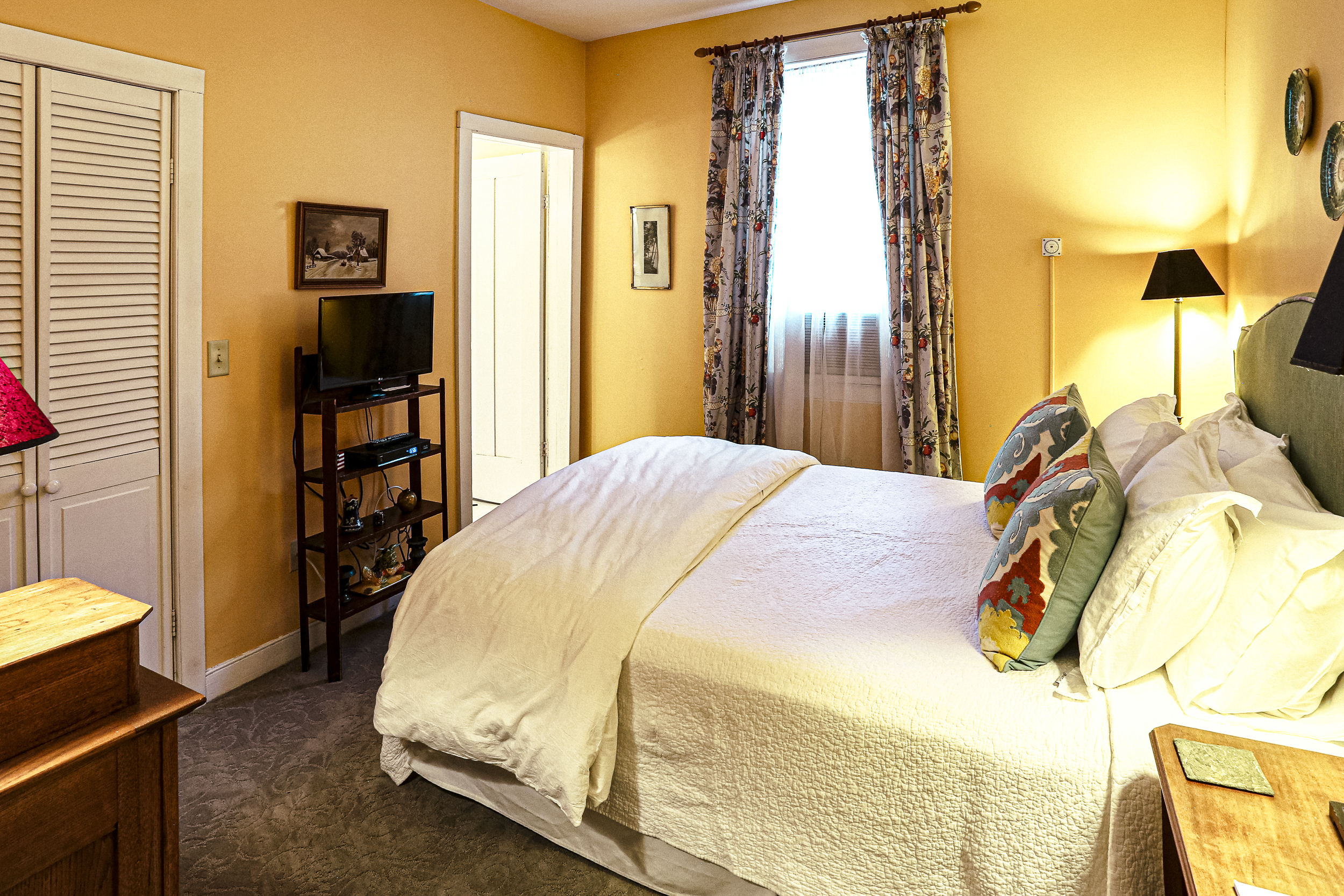 Facing the backyard, this 2nd floor guest room welcomes the morning sun with its warm color scheme. Queen bed, private bath, smartTV with free Hulu access, and mini refrigerator. Important: If you are making a last minute reservation (within 24 hours), please contact the innkeepers at (410) 913-9123 personally so that we can prepare for your arrival. Full payment is required at time of reservation.